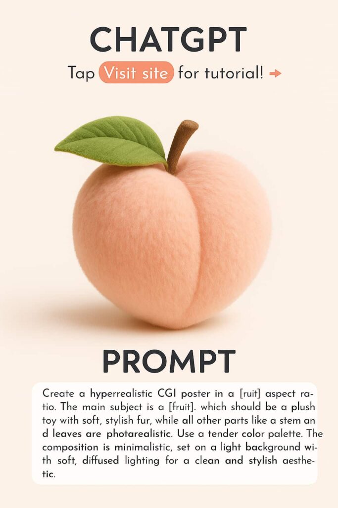 Want to design a soft, hyperrealistic CGI poster featuring a plush fruit toy with elegant fur textures and photorealistic natural details? This creative AI art prompt is perfect for 3D artists, designers, and digital illustrators who want to blend realism with softness to create adorable, stylish, and gallery-grade visuals