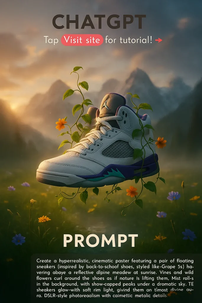 Create a hyperrealistic, cinematic poster featuring a pair of floating sneakers(Branded) hovering above a reflective alpine meadow at sunrise. Vines and wildflowers curl around the shoes as if nature is lifting them. Mist rolls in the background, with snow-capped peaks under a dramatic sky. The sneakers glow with soft rim light, giving them an almost divine aura. DSLR-style photorealism with shallow depth of field, polished metallic details, and a cinematic vignette.